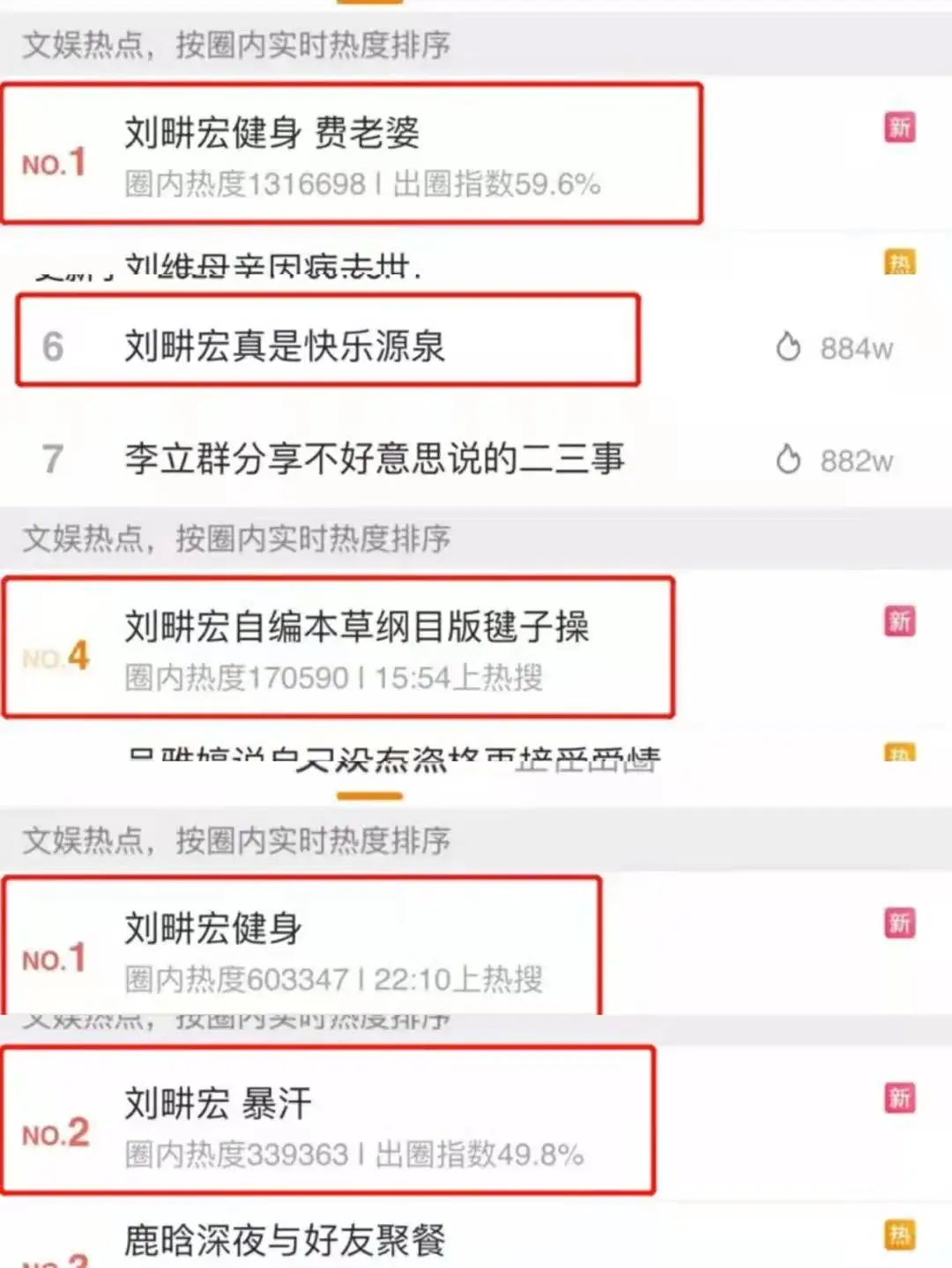 他们俩的这一跳,直接就跳出了几个微博热搜。其中,微博话题#刘畊宏直播#、#刘畊宏回应穿羽绒服跳操#、#刘畊宏健身#、#刘畊宏自编本草纲目版毽子操#等话题接连三天冲上热搜,位列高位。
