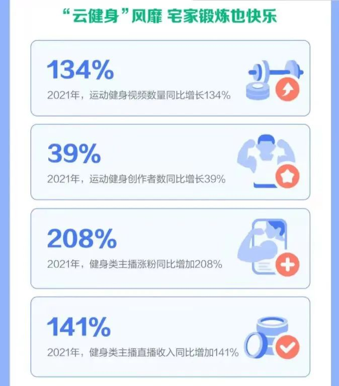 事实上,不独刘畊宏的健身直播,在几个主流内容平台,居家锻炼正成为一个颇具热度的内容赛道。以抖音为例,《抖音运动健身报告》显示,截至2021年12月7日,粉丝过万的运动健身创作者超6万名,运动类主播2021年直播收入同比增长141%。