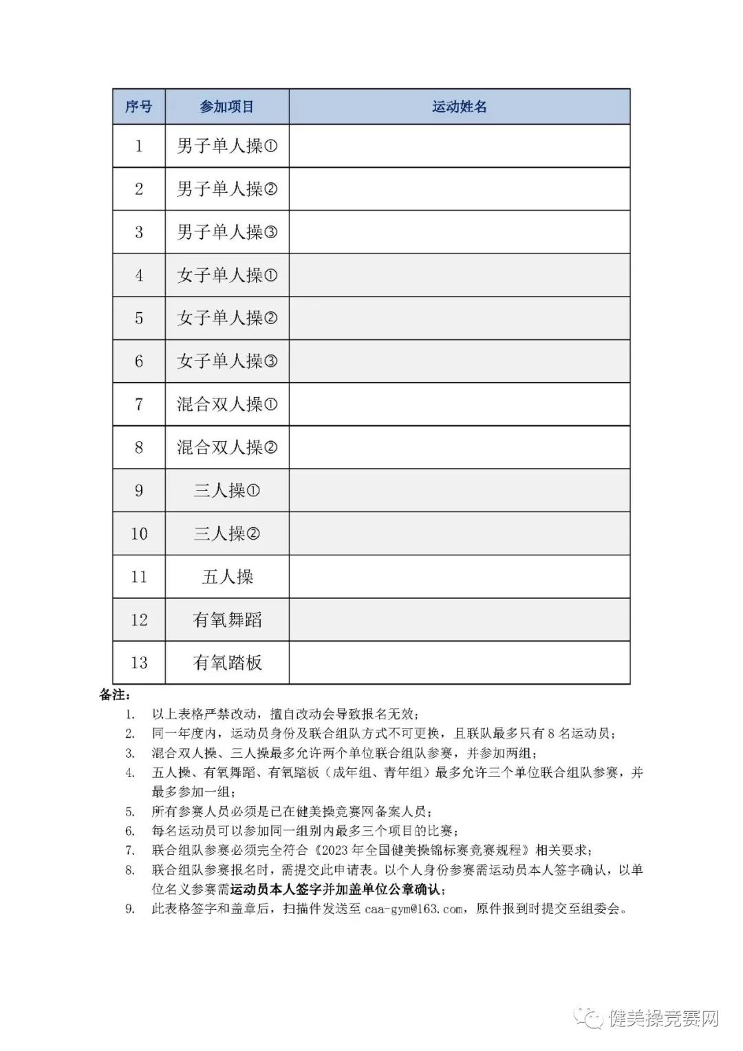 (一)各参赛单位及个人通过中国健美操协会在线系统http://www.caa-gym.org/正式提交报名,并将报名材料发送至caa-gym@163.com和787185918@qq.com,报名截止时间为2023年7月12日12:00,材料不全或不符合要求,报名不予受理,逾期不予补报。报名成功的认定以系统报名成功且报名材料提交齐全为准确定,二者缺一不可。